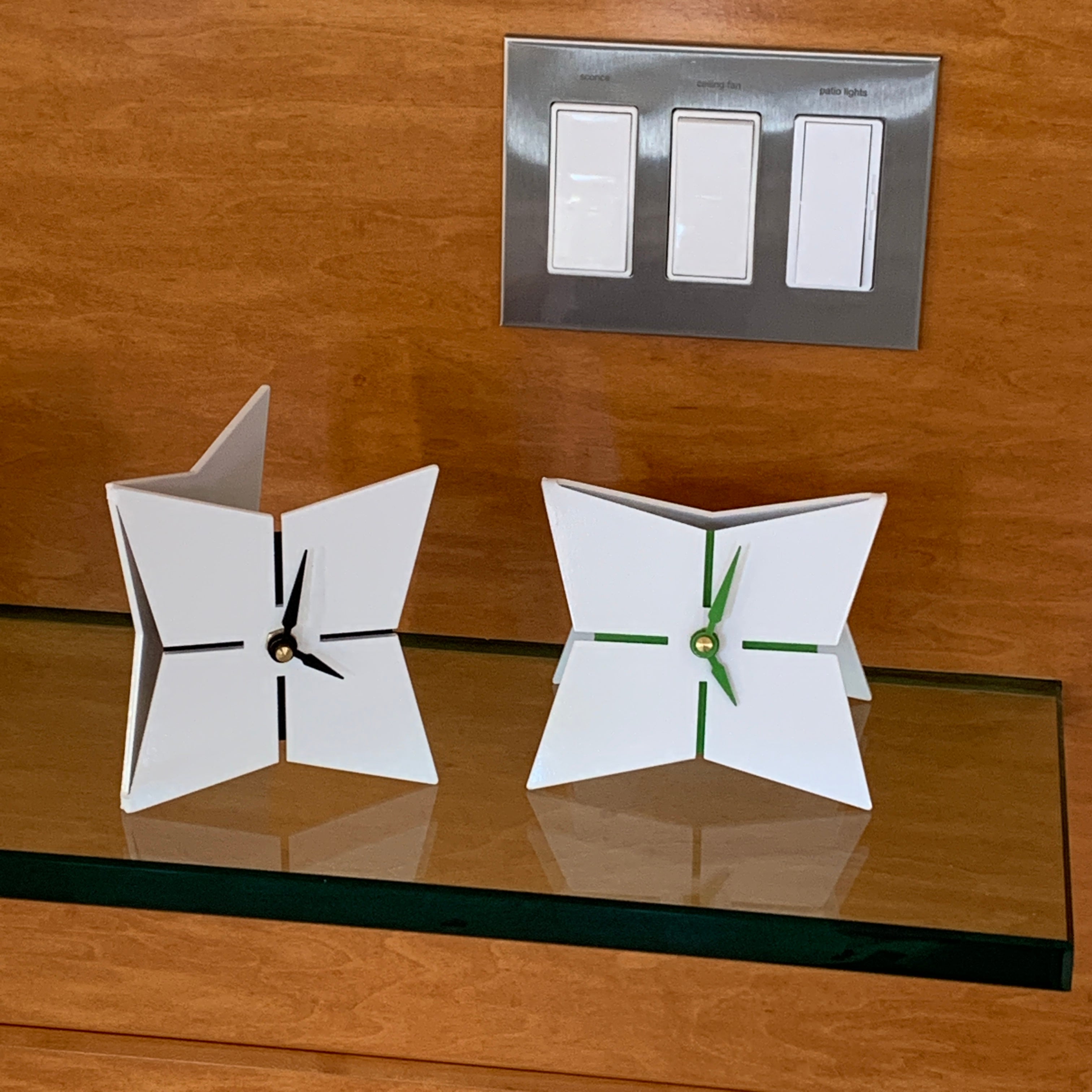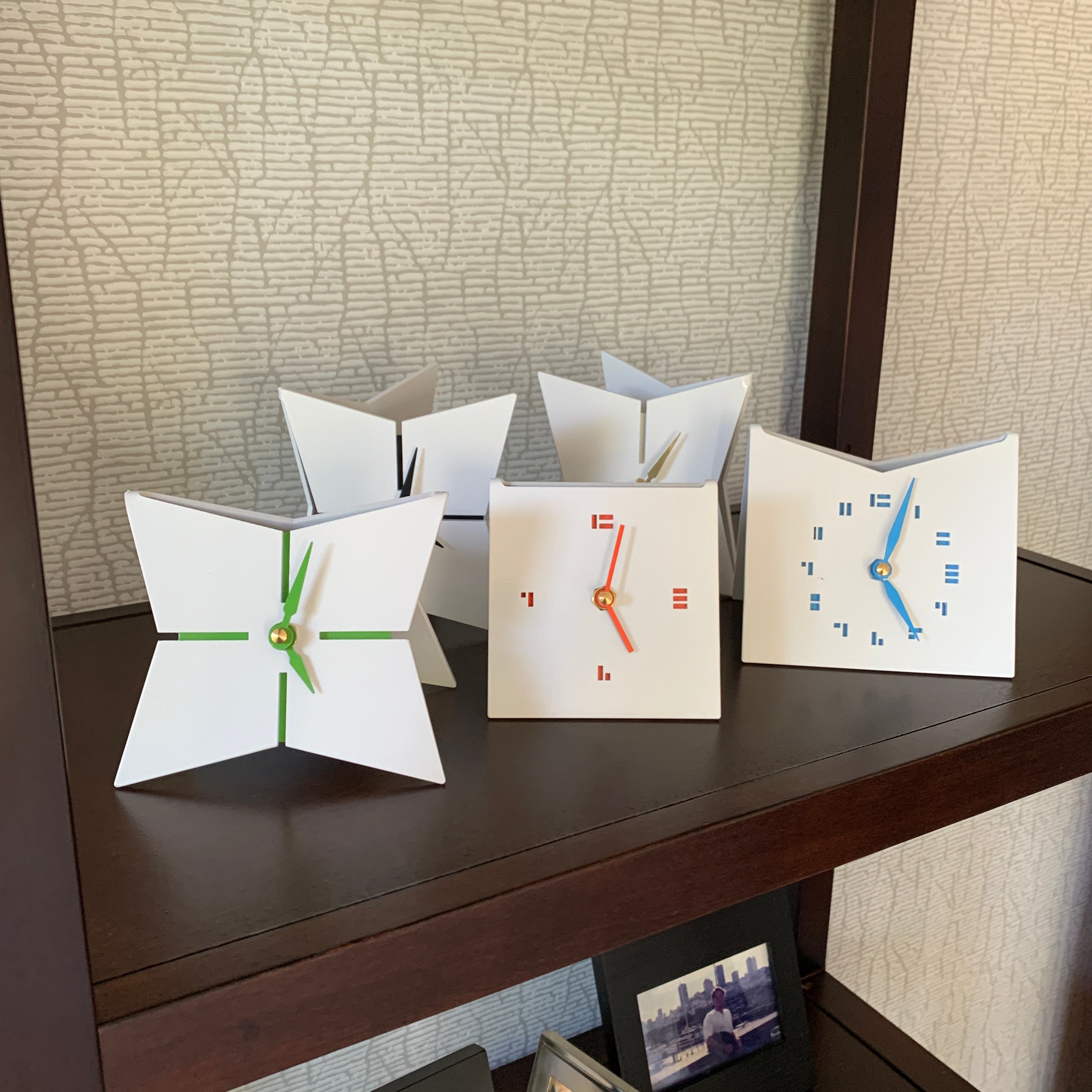 The KittyKat Clock is 5" W x 3.5" D x 4.5" H , The SimpleDesk Clock is 4" W x 3" D x 4" H, The StarFish Clock is 5" W x 3.5" D x 4.5" H and can be displayed in its side so it is taller.