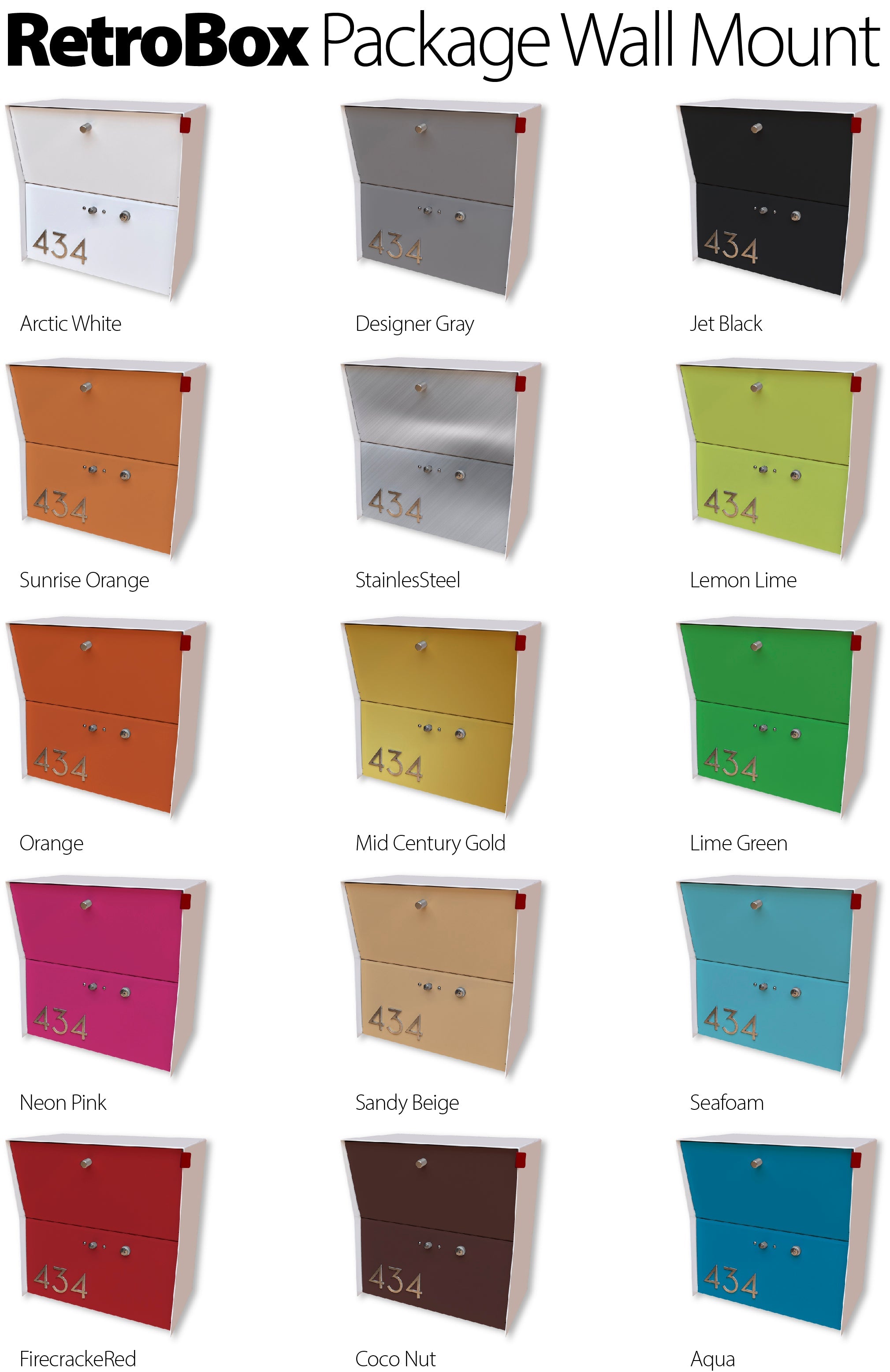 -The RetroBox Small Package Wall Mounted Mailbox in Coco Nut is available in 15 different door finishes, can be ordered with stainless steel numbers in your choice of number styles, (Retro or Uptown), OR LEAVE BLANK IF YOU DO NOT WANT NUMBERS ON THE FRONT DOOR